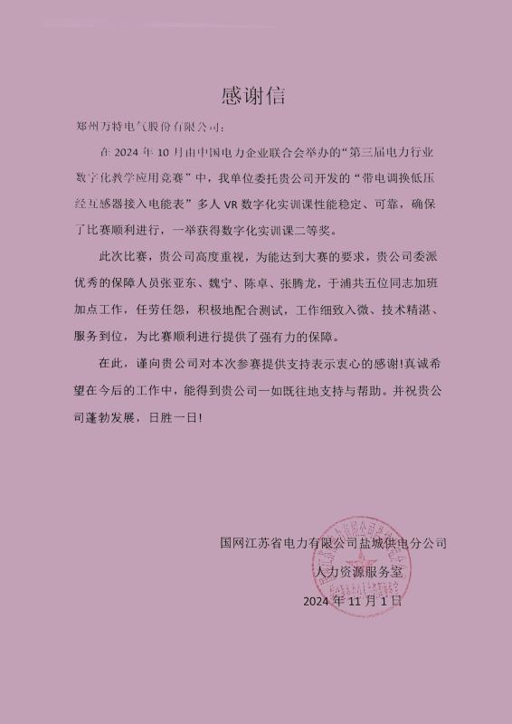 2024年11月1日,公司收到了來(lái)自國(guó)網(wǎng)江蘇省電力有限公司鹽城供電分公司的感謝信,對(duì)公司在“第三屆電力行業(yè)數(shù)字化教學(xué)應(yīng)用競(jìng)賽”中的卓越貢獻(xiàn)表示高度贊揚(yáng)和衷心感謝。