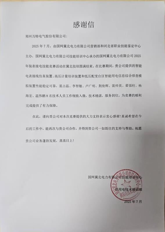 在剛剛結(jié)束的國網(wǎng)河南電力裝表接電及反竊電技能競賽和國網(wǎng)冀北電力聯(lián)合河北省職業(yè)技能鑒定中心主辦的裝表接電賽事中,面對(duì)分布式能源安裝、線損分析等復(fù)雜場景,公司設(shè)備全程穩(wěn)定運(yùn)行,為大賽順利進(jìn)行提供了關(guān)鍵技術(shù)保障。客戶分別在感謝信中強(qiáng)調(diào),我司派遣的技術(shù)人員“細(xì)致入微,技術(shù)精湛,服務(wù)到位”、“堅(jiān)守崗位,保障賽事零故障”。